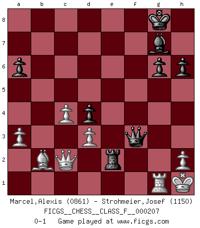 Last move : 0-1 2018 December 18 18:59:33 [Event "FICGS__CHESS__CLASS_F__000207"] [Site "FICGS"] [Date "2018.09.28"] [Round "1"] [White "Marcel,Alexis"] [Black "Strohmeier,Josef"] [Result "0-1"] [WhiteElo "0861"] [BlackElo "1150"] 1.f4 d5 2.Nf3 g6 3.e3 Bg7 4.Be2 Nf6 5.O-O O-O 6.b3 c5 7.Bb2 Nc6 8.a3 a6 9.Nc3 d4 10.Na4 b6 11.exd4 cxd4 12.d3 b5 13.Nc5 Nd5 14.Qd2 Qb6 15.Ne4 Bd7 16.c4 Ne3 17.Rf2 e5 18.fxe5 Ng4 19.R2f1 Ngxe5 20.Nxe5 Nxe5 21.Ng5 h6 22.Nf3 Nxf3+ 23.Bxf3 Rae8 24.Bd5 Be6 25.Bxe6 Rxe6 26.Rae1 Rfe8 27.Rxe6 Rxe6 28.Qf4 f5 29.Qf2 bxc4 30.bxc4 Re3 31.Qc2 Qe6 32.Kf2 Qe5 33.g3 f4 34.gxf4 Qxf4+ 35.Kg2 Qg4+ 36.Kh1 Re2 37.Rg1 Qf3+ 0-1 Bird's Opening Kingside Castling by player White (move 5) Kingside Castling by player Black (move 5) Player Black won this chess game. Follow this game move after move (download)Chess is a terrible game. If you have no center, your opponent has a freer position. If you do have a center, then you really have something to worry about ! (Siegbert Tarrasch) Schach ist mein Leben, meine Leidenschaft, was ich gelernt habe und seit meinem 14. Lebensjahr profimässig praktiziere. Darauf zu verzichten, würde mir sehr schwer fallen. (Viktor Kortschnoi) Vive, pierde y aprende al observar a tu oponente como ganar. (Amber Steenbock) Les échecs c'est le défi de l'alpiniste, toujours plus haut, prêt à tout pour monter à l'assaut du Roi ennemi. Les échecs, c'est de la musique en mouvement, un ballet majestueux pour les yeux. C'est de la poésie composée par les fantômes du passé qui au même titre que Rimbaud ou Verlaine méritent notre admiration. Les échecs, c'est de la peinture ou le moindre mouvement modifie le tableau pour en faire un Picasso ou un Van Gogh. Les échecs, c'est tout et rien, c'est la vie et la mort. Jjulie33 sur le forum de France-Echecs. Treat your password like your toothbrush. Don't let anybody else use it, and get a new one every six months. (Clifford Stoll)