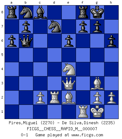 Last move : 0-1 2007 September 3 0:54:13 [Event "FICGS__CHESS__RAPID_M__000007"] [Site "FICGS"] [Date "2007.05.20"] [Round "1"] [White "Pires,Miguel"] [Black "De Silva,Dinesh"] [Result "0-1"] [WhiteElo "2270"] [BlackElo "2235"] 1.e4 c5 2.Nf3 d6 3.d4 cxd4 4.Nxd4 Nf6 5.Nc3 a6 6.Bg5 e6 7.f4 Qb6 8.Qd2 Qxb2 9.Rb1 Qa3 10.e5 dxe5 11.fxe5 Nfd7 12.Ne4 h6 13.Bh4 Qxa2 14.Rd1 Qd5 15.Qe3 Qxe5 16.Be2 Bc5 17.Bg3 Bxd4 18.Rxd4 Qa5+ 19.Rd2 O-O 20.O-O Qb6 0-1 This chess game has been lost on time (started : 2007.05.20 22:54:43) Sicilian : Najdorf, 7...Qb6 Kingside Castling by player Black (move 19) Kingside Castling by player White (move 20) Player Black won this chess game. Follow this game move after move (download)I am the best player in the world and I am here to prove it. (Bobby Fischer) Ich könnte leicht behaupten: Ja,ja, Leonid Breschnew wollte nicht, daß ich Weltmeister werde. In der Tat war die Sache komplizierter. (Viktor Kortschnoi) Aquel que teme a un Peón de Reina aislado, debería de retirarse del Ajedrez. (Siegbert Tarrasch) Avant la finale, les dieux ont créé le milieu de partie. (Tarrasch) I find television to be very educating. Every time somebody turns on the set, I go in the other room and read a book. (Groucho Marx)