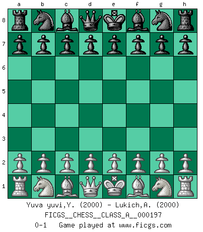 Last move : 0-1 2018 November 7 22:9:12 [Event "FICGS__CHESS__CLASS_A__000197"] [Site "FICGS"] [Date "2018.09.28"] [Round "1"] [White "Yuva yuvi,Yuvaraj"] [Black "Lukich,Aleksandar"] [Result "0-1"] [WhiteElo "2000"] [BlackElo "2000"] 0-1 This chess game has been lost on time (started : 2018.09.28 20:53:24) Player Black won this chess game. Follow this game move after move (download)A win by an unsound combination, however showy, fills me with artistic horror. (Wilhelm Steinitz) Es ist schade, dass viele Schachsportler vergessen, wie wichtig Auftreten und angemessene Kleidung sind. (Alexandra Kosteniuk) El Ajedrez es tan inspirador que yo no creo que un buen jugador sea capaz de tener un pensamiento malo durante una partida. (Wilhelm Steinitz) Il vaut mieux sacrifier les pièces de l'adversaire. (Xavier Tartacover) May I never be complete. May I never be content. May I never be perfect. Deliver me, Tyler, from being perfect and complete. (Chuck Palahniuk, Fight Club)