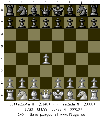 Last move : 1-0 2018 November 9 22:17:10 [Event "FICGS__CHESS__CLASS_A__000197"] [Site "FICGS"] [Date "2018.09.28"] [Round "1"] [White "Duttagupta,Aniruddha"] [Black "Arriagada,Natalicio"] [Result "1-0"] [WhiteElo "2140"] [BlackElo "2000"] 1.d4 1-0 This chess game has been lost on time (started : 2018.09.28 20:53:24) Queen's pawn Player White won this chess game. Follow this game move after move (download)Fischer sacrificed virtually everything most of us weakies (to use his term) value, respect, and cherish, for the sake of an artful, often beautiful board game, for the ambivalent privilege of being its greatest master. (Paul Kollar) In der Schule lernt man nichts. Es ist nur Zeitverschwendung. (Robert James Fischer) Un mal plan es mejor que no tener ningún plan. (Frank Marshall) L'attaque fait le spectacle, la défense gagne les matchs. (Dicton footballistique) Nobody is always a winner, and anybody who says he is, is either a liar or doesn't play poker. (Amarillo Slim)
