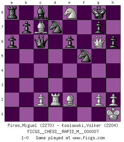Last move : 1-0 2007 July 26 21:40:49 [Event "FICGS__CHESS__RAPID_M__000007"] [Site "FICGS"] [Date "2007.05.20"] [Round "1"] [White "Pires,Miguel"] [Black "Koslowski,Volker"] [Result "1-0"] [WhiteElo "2270"] [BlackElo "2204"] 1.e4 c5 2.Nf3 d6 3.d4 cxd4 4.Nxd4 Nf6 5.Nc3 a6 6.Bg5 e6 7.f4 Qb6 8.Qd2 Qxb2 9.Rb1 Qa3 10.e5 dxe5 11.fxe5 Nfd7 12.Ne4 Qxa2 13.Rd1 h6 14.Bh4 Qd5 15.Qe3 Qxe5 16.Be2 Bc5 17.Bg3 Bxd4 18.Rxd4 Qa5+ 19.Rd2 O-O 20.Bd6 Re8 21.O-O Nc6 22.Qg3 Qb6+ 23.Kh1 Ne7 24.Bc7 Qc6 25.Rxf7 Kxf7 26.Nd6+ Kg8 27.Nxe8 Nf5 28.Qg6 1-0 Sicilian : Najdorf, 7...Qb6 Kingside Castling by player Black (move 19) Kingside Castling by player White (move 21) Player White won this chess game. Follow this game move after move (download)Personally, I rather look forward to a computer program winning the world Chess Championship. Humanity needs a lesson in humility. (Richard Dawkings) Ich würde mich als ganz normalen Jungen bezeichnen [Im Alter von 12]. (Sergej Karjakin) El Ajedrez expande y enriquece tu mente. (Saudin Robovic) Lorsque vous vous retrouvez devant une position atroce, ne tendez pas un ultime piège dérisoire avec l'intention d'abandonner si l'adversaire le déjoue ! Faites-vous plutôt un devoir de résister comme si votre vie en dépendait. Jouez le coup qui vous déplairait au centuple si vous étiez dans la peau de votre tortionnaire ! It's not a bug - it's an undocumented feature. (Anonymous)