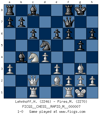 Last move : 1-0 2007 September 1 0:31:42 [Event "FICGS__CHESS__RAPID_M__000007"] [Site "FICGS"] [Date "2007.05.20"] [Round "1"] [White "Lehnhoff,Heinz-Georg"] [Black "Pires,Miguel"] [Result "1-0"] [WhiteElo "2246"] [BlackElo "2270"] 1.d4 d5 2.c4 c6 3.Nf3 e6 4.Nc3 Nf6 5.Bg5 Be7 6.e3 Nbd7 7.Qc2 O-O 8.Rd1 h6 9.Bh4 Nb6 10.b3 Bb4 11.Bd3 g5 12.Bg3 dxc4 13.bxc4 Nfd5 14.cxd5 Nxd5 15.O-O Nxc3 16.Rc1 Nd5 17.Ne5 f6 18.Be2 Qe8 19.Nc4 Qf7 20.a3 1-0 This chess game has been lost on time (started : 2007.05.20 22:54:43) QGD Slav : 3.Nf3 Kingside Castling by player Black (move 7) Kingside Castling by player White (move 15) Player White won this chess game. Follow this game move after move (download)Checkers is for tramps. (Paul Morphy) Um sich vor der Gefahr einer Erkältung zu schützen, sorge der wanderlustige König beizeiten für ein brauchbares Versteck. (Aaron Nimzowitsch) Tu cuerpo tiene que estar en óptima condición. Tu Ajedrez se deteriora como lo hace tu cuerpo. No puedes separar la mente y el cuerpo. (Bobby Fischer) Le système Elo représente seulement une moyenne. Il est simplement un indicateur de votre stabilité. (Anatoli Karpov) The general who wins the battle makes many calculations in his temple before the battle is fought. The general who loses makes but few calculations beforehand. (Sun Tzu)