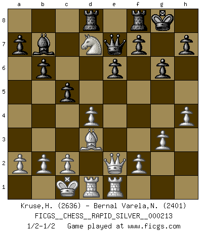 Last move : 1/2-1/2 2018 October 17 10:50:49 [Event "FICGS__CHESS__RAPID_SILVER__000213"] [Site "FICGS"] [Date "2018.09.29"] [Round "1"] [White "Kruse,Herbert"] [Black "Bernal Varela,Nelson"] [Result "1/2-1/2"] [WhiteElo "2636"] [BlackElo "2401"] 1.e4 e6 2.d4 d5 3.Nc3 Nf6 4.Bg5 dxe4 5.Nxe4 Be7 6.Bxf6 Bxf6 7.Nf3 Nd7 8.Qd2 O-O 9.O-O-O b6 10.Nxf6+ Nxf6 11.Ne5 Bb7 12.Bd3 Qe7 13.Rhe1 Rad8 14.g3 Nd7 15.Qe2 g6 16.h4 c5 17.Nxd7 1/2-1/2 French : Burn variation Kingside Castling by player Black (move 8) Queenside Castling by player White (move 9) This chess game ended in a draw. Follow this game move after move (download)Don't even mention losing to me. I can't stand to think of it. (Bobby Fischer) Ich hatte meine größten Erfolge, als ich 47 Jahre alt war. Kasparow war noch nicht mal 42 und hat das Schach schon im Stich gelassen. (Viktor Kortschnoi) Los tropiezos estan todos ahí en el tablero, esperando que se cometan. (Savielly Tartakover) Les Echecs, c'est l'art de la guerre sans les charniers, c'est la résurrection des morts tombés au champ d'honneur, l'espoir perpétuel, la suprématie de l'intelligence sur la force, la culture de l'esprit. (F. Szpiner) War is the child of passion, passion is the child of narcissism and narcissism is the child. (...) Another game ? (Thibault de Vassal)