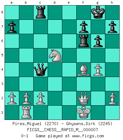 Last move : 0-1 2007 August 16 17:21:41 [Event "FICGS__CHESS__RAPID_M__000007"] [Site "FICGS"] [Date "2007.05.20"] [Round "1"] [White "Pires,Miguel"] [Black "Ghysens,Dirk"] [Result "0-1"] [WhiteElo "2270"] [BlackElo "2245"] 1.e4 e5 2.Bb5 c6 3.Ba4 Nf6 4.Qe2 Bc5 5.Nf3 d5 6.exd5 O-O 7.dxc6 Nxc6 8.Bxc6 bxc6 9.d3 e4 10.dxe4 Nxe4 11.Qxe4 Re8 12.Ne5 Bd4 13.O-O Rxe5 14.Qxc6 Bd7 15.Qf3 Bb5 16.Nc3 Bxf1 17.Kxf1 Rc8 18.Bd2 Qb6 19.Rb1 g6 20.g4 Re6 21.Qg3 Bxf2 22.Qxf2 Rf6 23.Bf4 Qb4 24.Nd5 Qc4+ 0-1 King's pawn game Kingside Castling by player Black (move 6) Kingside Castling by player White (move 13) Player Black won this chess game. Follow this game move after move (download)Chess is a cold bath for the mind. (Sir John Simon) Wie kann ich Remis annehmen? Ich weiß ja gar nicht, wie ich stehe! (Fritz Sämisch) Haz el enroque temprano y seguido. (Rob Sillars) Ce qui est bien, c'est d'avoir tout un tas de pièces en prise : l'adversaire ne peut en prendre qu'une à la fois. Cité par Thierry Audin. Establishing goals is all right if you don't let them deprive you of interesting detours. (Doug Larson)