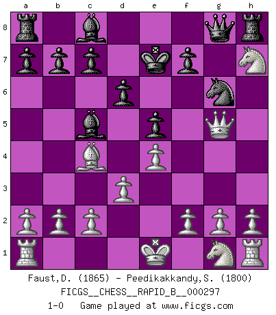Last move : 1-0 2018 December 10 16:38:0 [Event "FICGS__CHESS__RAPID_B__000297"] [Site "FICGS"] [Date "2018.09.29"] [Round "1"] [White "Faust,Dieter"] [Black "Peedikakkandy,Sameer"] [Result "1-0"] [WhiteElo "1865"] [BlackElo "1800"] 1.e4 e5 2.Nc3 Nc6 3.Bc4 Nf6 4.d3 Bc5 5.Bg5 d6 6.Nd5 Ne7 7.Bxf6 gxf6 8.Nxf6+ Kf8 9.Qh5 Ng6 10.Qh6+ Ke7 11.Nxh7 Qg8 12.Qg5+ 1-0 Vienna game, Max Lange defense Player White won this chess game. Follow this game move after move (download)We must make sure that Chess will not be like a dead language, very interesting, but for a very small group. (Sytze Faber) Frage: Was machen Sie mit den Preisen? Anwort: Ich habe Angst, dass meine Freundin davon neue Kleider kauft. (Loek van Wely) Bobby es el jugador de Ajedrez mas fino que este país jamás haya producido. Su memoria para las movidas, su brillantez en soñar combinaciones y su feróz determinación por la victoria son algo extraño. (John Collins) Mais n'est-ce pas déjà le limiter injurieusement que d'appeler les échecs un jeu? N'est-ce pas aussi une science, un art, ou quelque chose qui, comme le cercueil de Mahomet entre ciel et terre, est suspendu entre l'un et l'autre, et qui réunit un nombre incroyable de contraires ? (Stefan Zweig) Optimism is a variety of information deficit. Sometimes especially true for correspondence chess games. (Michael Aigner)