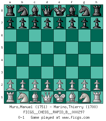 Last move : 0-1 2018 October 29 21:11:23 [Event "FICGS__CHESS__RAPID_B__000297"] [Site "FICGS"] [Date "2018.09.29"] [Round "1"] [White "Muro,Manuel"] [Black "Marino,Thierry"] [Result "0-1"] [WhiteElo "1751"] [BlackElo "1700"] 0-1 This chess game has been lost on time (started : 2018.09.29 15:3:59) Player Black won this chess game. Follow this game move after move (download)Chess is a beautiful mistress. (Bent Larsen) Man gibt nur Pakete auf. (Paul Keres) Nunca nadie ha ganado una partida de Ajedrez rindiendose. (Unknown) Les ravages du H expliquent la différence de niveau entre Tal et Thal [Abergel]. The only thing that matters is the evidence. (Horatio Caine, C.S.I. Miami)