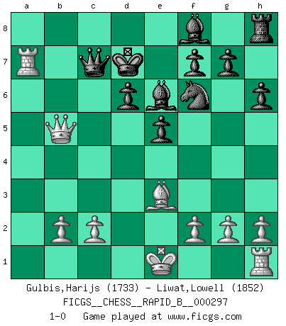 Last move : 1-0 2018 October 2 8:15:11 [Event "FICGS__CHESS__RAPID_B__000297"] [Site "FICGS"] [Date "2018.09.29"] [Round "1"] [White "Gulbis,Harijs"] [Black "Liwat,Lowell"] [Result "1-0"] [WhiteElo "1733"] [BlackElo "1852"] 1.e4 c5 2.Nf3 Nc6 3.d4 cxd4 4.Nxd4 e5 5.Nb5 d6 6.N1c3 a6 7.Na3 b5 8.Nd5 h6 9.Bxb5 axb5 10.Nxb5 Ra7 11.Nxa7 Nxa7 12.Be3 Be6 13.a4 Nc8 14.a5 Nf6 15.a6 Nxe4 16.a7 Nxa7 17.Rxa7 Nf6 18.Nc7+ Kd7 19.Qd3 Qxc7 20.Qb5+ 1-0 Sicilian : Labourdonnais-Loewenthal (Kalashnikov) variation Player White won this chess game. Follow this game move after move (download)The blunders are all there on the board, waiting to be made. (Savielly Tartakover) Der zweitbeste Zug ist oft der einzig richtige. (Savielly Grigorievitsch Tartakower) Si tu oponente te ofrece un empate, trata de averiguar porque piensa él que esta en una posición peor. (Nigel Short) Dieu déplace le joueur, et celui-ci la pièce. Quel Dieu derrière Dieu commence donc la trame ? Arturo Perez-Reverte (prix de littérature policière 1993). To be champion requires more than simply being a strong player; one has to be a strong human being as well. (Anatoly Karpov)