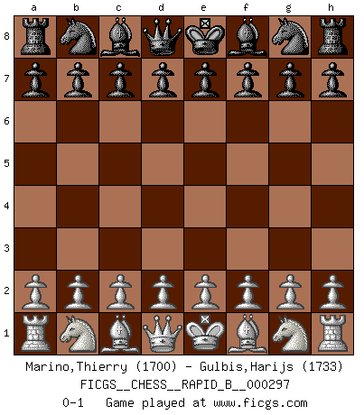 Last move : 0-1 2018 October 29 21:11:23 [Event "FICGS__CHESS__RAPID_B__000297"] [Site "FICGS"] [Date "2018.09.29"] [Round "1"] [White "Marino,Thierry"] [Black "Gulbis,Harijs"] [Result "0-1"] [WhiteElo "1700"] [BlackElo "1733"] 0-1 This chess game has been lost on time (started : 2018.09.29 15:3:59) Player Black won this chess game. Follow this game move after move (download)Nowadays, when you're not a grandmaster at 14, you can forget about it. (Anand Viswanathan) Ich verlor meine Bürgerrechte, mein Gehalt wurde mir nicht mehr bezahlt und ich wurde zensiert und durfte nicht mehr ins Ausland reisen. [nach dem Match Fischer-Taimanov 6:0] (Mark Taimanov) El Ajedrez es un juego terrible. Si no dominas el centro, tu oponente tiene una posición mas libre. Si tu tienes el centro, entonces realmente tienes algo de que preocuparte. (Siegbert Tarrasch) Celui qui prend des risques peut perdre, celui qui n'en prend pas perd toujours. (Xavier Tartacover) It's not a bug - it's an undocumented feature. (Anonymous)