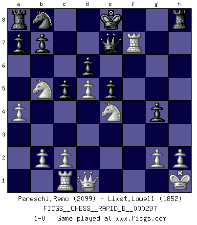 Last move : 1-0 2018 October 4 15:3:22 [Event "FICGS__CHESS__RAPID_B__000297"] [Site "FICGS"] [Date "2018.09.29"] [Round "1"] [White "Pareschi,Remo"] [Black "Liwat,Lowell"] [Result "1-0"] [WhiteElo "2099"] [BlackElo "1852"] 1.d4 c5 2.d5 e5 3.e4 d6 4.Nc3 Be7 5.Nf3 g5 6.Be2 g4 7.Nd2 h5 8.f3 Nh6 9.a4 f5 10.exf5 Bxf5 11.O-O Bg5 12.fxg4 Be3+ 13.Kh1 Bxg4 14.Nde4 Bxc1 15.Rxc1 Qe7 16.Nb5 Nf7 17.Bxg4 hxg4 18.Rxf7 1-0 Semi-Benoni (`blockade variation') Kingside Castling by player White (move 11) Player White won this chess game. Follow this game move after move (download)One bad move nullifies forty good ones. (Horowitz) Wer der Ansicht ist, daß alle Schachspieler verrückt sind, wird durch Studium des Lebens von Emil Josef Diemer nicht auf andere Gedanken kommen. (Hans Ree) Buenas posiciones no logran ganar juegos, buenas movidas sí. (Gerald Abrahams) Les échecs, c'est l'art d'analyser. (Mikhail Botvinnik) The difference between stupidity and genius is that genius has its limits. (Murphy)
