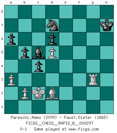 Last move : 0-1 2019 February 25 21:25:50 [Event "FICGS__CHESS__RAPID_B__000297"] [Site "FICGS"] [Date "2018.09.29"] [Round "1"] [White "Pareschi,Remo"] [Black "Faust,Dieter"] [Result "0-1"] [WhiteElo "2099"] [BlackElo "1865"] 1.d4 Nf6 2.c4 e6 3.Nc3 Bb4 4.Bg5 c5 5.d5 h6 6.Bh4 b5 7.e4 g5 8.Bg3 exd5 9.cxd5 Nxe4 10.Qc2 O-O 11.Nge2 Nxc3 12.Nxc3 a6 13.O-O-O f5 14.h4 d6 15.hxg5 Qxg5+ 16.Kb1 c4 17.Bh4 Qg7 18.Ne2 f4 19.Nd4 Bg4 20.Be2 Bxe2 21.Qxe2 Nd7 22.Qc2 Rf7 23.Ne6 Qh7 24.Qxh7+ Rxh7 25.Nxf4 Re8 26.Ne6 Nf8 27.a3 Ba5 28.Nd4 Bc7 29.g4 Nd7 30.f4 Bb6 31.Nf5 Bc5 32.Be1 h5 33.g5 Rf8 34.Nh6+ Rxh6 35.gxh6 Rf5 36.Rd2 Kh7 37.Rg2 Nf6 38.Rg5 Rxf4 39.Bd2 Rg4 40.R1xh5 Rxg5 41.Rxg5 Kxh6 42.Kc2 Nd7 43.Rg3+ Kh7 0-1 Nimzo-Indian : Leningrad variation Kingside Castling by player Black (move 10) Queenside Castling by player White (move 13) Player Black won this chess game. Follow this game move after move (download)Chess opens and enriches your mind. (Saudin Robovic) Ohne Fehler kann es keine Brillanz geben. (Emanuel Lasker) Aunque la mayoría de la gente disfruta observar las partidas de los grandes Maestros de ataque, algunos de los jugadores mas notables en la historia han sido los jugadores silenciosos posicionales. Lentamente ellos te aplastan despojandote de tu espacio, congestionando tus piezas y dejandote virtualmente sin nada que hacer. (Yasser Seirawan) Il n'y a plus de joueurs du niveau de Jacob Murray dont la seule quête est le beau jeu, le plaisir de voir les pièces construire quelque chose. Sur 10 idées à la minute, 9 seront sans intérêt, la dernière s'avèrera géniale. (Christian Bauer) Hold em is to stud what chess is to checkers. (Johnny Moss)