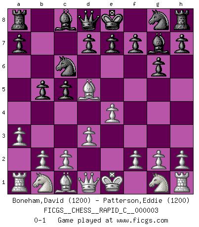 Last move : 0-1 2006 July 18 14:13:14 [Event "FICGS__CHESS__RAPID_C__000003"] [Site "FICGS"] [Date "2006.06.08"] [Round "1"] [White "Boneham,David"] [Black "Patterson,Eddie"] [Result "0-1"] [WhiteElo "1200"] [BlackElo "1200"] 1.e4 c5 2.Bc4 g6 3.d3 Bg7 4.a3 b5 5.Bd5 Nc6 0-1 This chess game has been lost on time (started : 2006.06.08 0:34:51) Sicilian defense Player Black won this chess game. Follow this game move after move (download)The winner of the game is the player who makes the next-to-last mistake. (Savielly Tartakover) In der Schule lernt man nichts. Es ist nur Zeitverschwendung. (Robert James Fischer) El Ajedrez es una hermosa aventura. (Bent Larsen) Même un GMI sait rarement calculer sur plus de cinq coups une attaque à sacrifices. (Rudolf Spielmann) A good book on your shelf is a friend that turns its back on you and remains a friend. (Author unknown)