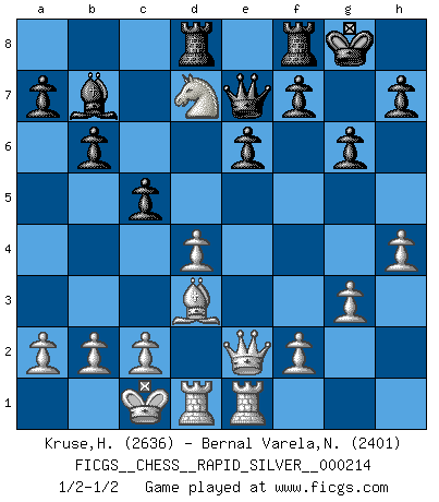 Last move : 1/2-1/2 2018 October 17 10:52:37 [Event "FICGS__CHESS__RAPID_SILVER__000214"] [Site "FICGS"] [Date "2018.10.01"] [Round "1"] [White "Kruse,Herbert"] [Black "Bernal Varela,Nelson"] [Result "1/2-1/2"] [WhiteElo "2636"] [BlackElo "2401"] 1.e4 e6 2.d4 d5 3.Nc3 Nf6 4.Bg5 dxe4 5.Nxe4 Be7 6.Bxf6 Bxf6 7.Nf3 Nd7 8.Qd2 O-O 9.O-O-O b6 10.Nxf6+ Nxf6 11.Bd3 Bb7 12.Ne5 Qe7 13.Rhe1 Rad8 14.g3 Nd7 15.Qe2 g6 16.h4 c5 17.Nxd7 1/2-1/2 French : Burn variation Kingside Castling by player Black (move 8) Queenside Castling by player White (move 9) This chess game ended in a draw. Follow this game move after move (download)When you don't know what to do, wait for your opponent to get an idea - it's sure to be wrong. (Tarrasch) Auf jeden Fall musst du zuerst Rechtsanwalt werden, damit du deine eigenen Interessen und die deiner Familie vertreten kannst. [Brief an seinen Sohn] (José Raúl Capablanca) Yo no le temo a Spassky. Todos saben que yo soy el mejor. Uno no necesita un torneo para probarlo. (Bobby Fischer) Karpov est une pièce de musée. (Garry Kasparov) Luck never made a man wise. (Seneca, Letters to Lucilius)