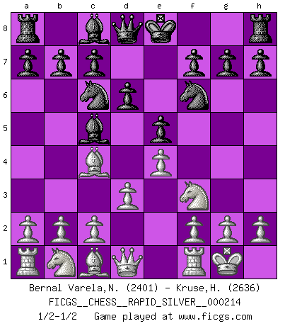 Last move : 1/2-1/2 2018 October 1 6:32:22 [Event "FICGS__CHESS__RAPID_SILVER__000214"] [Site "FICGS"] [Date "2018.10.01"] [Round "2"] [White "Bernal Varela,Nelson"] [Black "Kruse,Herbert"] [Result "1/2-1/2"] [WhiteElo "2401"] [BlackElo "2636"] 1.e4 e5 2.Nf3 Nc6 3.Bc4 Nf6 4.d3 Bc5 5.O-O d6 1/2-1/2 Two knights defense (Modern Bishop's Opening) Kingside Castling by player White (move 5) This chess game ended in a draw. Follow this game move after move (download)Fischer is the strongest player in the world. In fact, the strongest player who ever lived. (Larry Evans) Wie gewinnt Tal? Er entwickelt alle seine Figuren in die Brettmitte und opfert sie dann irgendwo. (Robert James Fischer) Un sacrificio se refuta mucho mejor al aceptarlo. (Wilhelm Steinitz) Je menace de comprendre la position. (Anonyme) Ah, beer! The cause of, and the solution to, all of life's problems. (Homer Simpson)