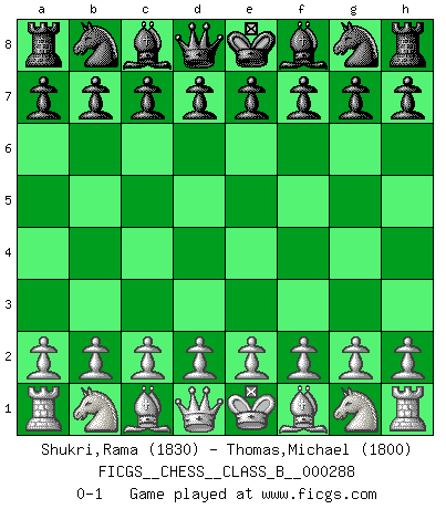 Last move : 0-1 2018 November 12 10:30:10 [Event "FICGS__CHESS__CLASS_B__000288"] [Site "FICGS"] [Date "2018.10.03"] [Round "1"] [White "Shukri,Rama"] [Black "Thomas,Michael"] [Result "0-1"] [WhiteElo "1830"] [BlackElo "1800"] 0-1 This chess game has been lost on time (started : 2018.10.03 9:44:51) Player Black won this chess game. Follow this game move after move (download)When you play Bobby, it is not a question if you win or lose. It is a question if you survive. (Boris Spassky) Capablanka war das größte Genie der Schachgeschichte! Aber denken sie nicht er habe nichts vom Schach verstanden. Er wusste nur soviel wie er wissen musste um seine Ziele zu erreichen. (Mikhail Moiseyevich Botvinik) ¿Cual es el objetivo de jugar una apertura de gambito?... Para adquirir una reputación de ser un jugador apuesto a costo de perder el juego. (Siegbert Tarrasch) Le système Elo représente seulement une moyenne. Il est simplement un indicateur de votre stabilité. (Anatoli Karpov) The general who wins the battle makes many calculations in his temple before the battle is fought. The general who loses makes but few calculations beforehand. (Sun Tzu)