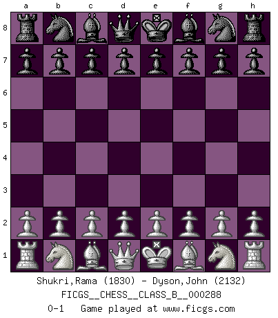 Last move : 0-1 2018 November 12 10:30:10 [Event "FICGS__CHESS__CLASS_B__000288"] [Site "FICGS"] [Date "2018.10.03"] [Round "1"] [White "Shukri,Rama"] [Black "Dyson,John"] [Result "0-1"] [WhiteElo "1830"] [BlackElo "2132"] 0-1 This chess game has been lost on time (started : 2018.10.03 9:44:51) Player Black won this chess game. Follow this game move after move (download)Chess, like love, is infectious at any age. (Flohr) Sie bekommen vielleicht den Eindruck, dass die Spitzenspieler überhaupt gar nicht so stark sind. Aber das stimmt nicht. Es ist eine Illusion. Mit einem Computer an der Seite ist es sehr leicht, Urteile zu fällen, aber wenn man alleine am Brett sitzt, sieht die Sache ganz anders aus. (Vladimir Kramnik) Después de una mala apertura, hay una esperanza en el juego medio. Pero una vez que estas en finales, el momento de la verdad ha llegado. (Edmar Mednis) 'L'échange des dames est un coup dur pour les deux adversaires...' Un journaliste lors d'une partie du match Spassky-Fischer Empty your mind, be formless, shapeless — like water. (Bruce Lee)