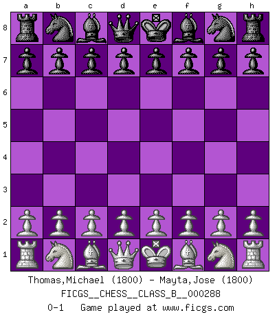 Last move : 0-1 2018 November 12 10:30:10 [Event "FICGS__CHESS__CLASS_B__000288"] [Site "FICGS"] [Date "2018.10.03"] [Round "1"] [White "Thomas,Michael"] [Black "Mayta,Jose"] [Result "0-1"] [WhiteElo "1800"] [BlackElo "1800"] 0-1 This chess game has been lost on time (started : 2018.10.03 9:44:51) Player Black won this chess game. Follow this game move after move (download)When you absolutely don't know what to do anymore, it is time to panic. (John van der Wiel) Du musst Deinen Gegner in einen tiefen dunklen Wald führen wo 2+2=5 ist und wo der Weg, der wieder hinausführt, nur breit genug für einen ist. (Mikhail Nekhemyevich Tal) El jugador táctico sabe que hacer cuando hay algo que hacer; mientras que el estratega sabe que hacer cuando no hay nada que hacer. (Gerald Abrahams) Si le désir cupide (et stupide) de gagner est une inépuisable source de souffrance, une combinaison brillante sur l'échiquier est une découverte : le coquelicot qui s'épanouit lorsque apparaît la Voie Lactée. (Arrabal) Big Chess is a place for big hallucinations. (Thibault de Vassal)