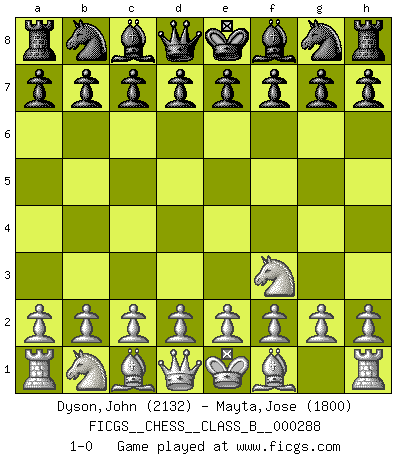 Last move : 1-0 2018 November 12 10:30:10 [Event "FICGS__CHESS__CLASS_B__000288"] [Site "FICGS"] [Date "2018.10.03"] [Round "1"] [White "Dyson,John"] [Black "Mayta,Jose"] [Result "1-0"] [WhiteElo "2132"] [BlackElo "1800"] 1.Nf3 1-0 This chess game has been lost on time (started : 2018.10.03 9:44:51) Reti Opening Player White won this chess game. Follow this game move after move (download)The tactician must know what to do whenever something needs doing; the strategist must know what to do when nothing needs doing. (Savielly Tartakover) Alles was am Schachbrett zählt sind gute Züge. (Robert James Fischer) Aquel que teme a un Peón de Reina aislado, debería de retirarse del Ajedrez. (Siegbert Tarrasch) La conception d'un plan est le processus par lequel un joueur exploite les avantages de sa position tout en s'efforçant d'en réduire au minimum les inconvénients. Afin de garantir le succès, un plan doit toujours se fonder sur un diagnostic objectif des particularités d'une position. La conception d'un plan est d'autant plus difficile que la position est équilibrée, et grandement facilitée lorsqu'il n'existe qu'un seul plan susceptible de répondre aux exigences de la position. (Harry Golombek) If you have any trouble condescending, find a Unix user to show you how it's done. (Scott Adams)