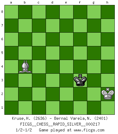 Last move : 1/2-1/2 2019 April 14 14:56:7 [Event "FICGS__CHESS__RAPID_SILVER__000217"] [Site "FICGS"] [Date "2018.10.04"] [Round "1"] [White "Kruse,Herbert"] [Black "Bernal Varela,Nelson"] [Result "1/2-1/2"] [WhiteElo "2636"] [BlackElo "2401"] 1.e4 e6 2.d4 d5 3.Nd2 c5 4.exd5 exd5 5.Ngf3 Nf6 6.Bb5+ Bd7 7.Bxd7+ Qxd7 8.O-O cxd4 9.Nb3 Nc6 10.Nbxd4 Be7 11.Be3 O-O 12.c3 Rfe8 13.Re1 Bd6 14.Qc2 Ne4 15.Rad1 Rad8 16.g3 h6 17.Kg2 Be7 18.h3 Nxd4 19.Rxd4 b6 20.R4d1 Bf6 21.Bd4 Be7 22.Rd3 Bc5 23.Be3 Qc6 24.Qd1 Qb7 25.Re2 Re6 26.Rc2 Rf6 27.Bf4 a5 28.Re2 Re6 29.Be3 Nf6 30.Nd4 Re5 31.Rc2 Rde8 32.Qf3 Qc8 33.Rc1 Re4 34.Bf4 Qa6 35.Rcd1 Bxd4 36.Rxd4 b5 37.Be3 Qe6 38.R4d2 Qc6 39.Bd4 R4e6 40.Rd3 Ne4 41.Qg4 Rg6 42.Qf3 a4 43.Re3 Rf8 44.b3 f5 45.Qf4 a3 46.Kh2 Re6 47.Re2 g5 48.Qf3 g4 49.Qf4 Ng5 50.Rxe6 Qxe6 51.Rd3 Nf3+ 52.Rxf3 gxf3 53.Qc7 Rf7 54.Qb8+ Rf8 55.Qb7 Rf7 56.Qa8+ Rf8 57.Qb7 Rf7 58.Qxb5 f4 59.gxf4 Rxf4 60.Qb8+ Rf8 61.Qg3+ Kf7 62.Qxf3+ Ke8 63.Qg4 Kd7 64.Bc5 Qxg4 65.hxg4 Rc8 66.Bb4 d4 67.cxd4 Rc2 68.Bxa3 Rxa2 69.Bc1 Rxf2+ 70.Kg3 Rf6 71.g5 Rf1 72.Be3 h5 73.g6 Rf6 74.Kh4 Rxg6 75.Kxh5 Rg7 76.b4 Ke6 77.Kh4 Kf5 78.Kh3 Ke4 79.Bc1 Rg1 80.Bd2 Rd1 81.Bg5 Kf3 82.Kh2 Rxd4 83.Be7 Rxb4 84.Bxb4 1/2-1/2 French : Tarrasch, Open, 4.ed ed Kingside Castling by player White (move 8) Kingside Castling by player Black (move 11) 10 pieces endgame at move 68 : White KBPPPPP , Black KRP WHITE : King + 1 Bishop 5 Pawns BLACK : King + 1 Rook 1 Pawn 9 pieces endgame at move 68 : White KBPPPP , Black KRP WHITE : King + 1 Bishop 4 Pawns BLACK : King + 1 Rook 1 Pawn 8 pieces endgame at move 69 : White KBPPP , Black KRP WHITE : King + 1 Bishop 3 Pawns BLACK : King + 1 Rook 1 Pawn 7 pieces endgame at move 74 : White KBPP , Black KRP WHITE : King + 1 Bishop 2 Pawns BLACK : King + 1 Rook 1 Pawn 6 pieces endgame at move 75 : White KBPP , Black KR WHITE : King + 1 Bishop 2 Pawns BLACK : King + 1 Rook 5 pieces endgame at move 82 : White KBP , Black KR WHITE : King + 1 Bishop 1 Pawn BLACK : King + 1 Rook 4 pieces endgame at move 83 : White KB , Black KR WHITE : King + 1 Bishop BLACK : King + 1 Rook 3 pieces endgame at move 84 : White KB , Black K WHITE : King + 1 Bishop BLACK : King + This chess game ended in a draw. Follow this game move after move (download)My style is somewhere between that of Tal and Petrosian. (Reshevsky) Karpov ist ein Museumsstück. (Garry Kasparov) Tu cuerpo tiene que estar en óptima condición. Tu Ajedrez se deteriora como lo hace tu cuerpo. No puedes separar la mente y el cuerpo. (Bobby Fischer) Il a essayé de se convaincre qu'il pourrait empêcher toutes les erreurs et ne jamais perdre. L'horreur ! Gary Kasparov au sujet de Robert Fischer. The man who strikes first admits that his ideas have given out. (Chinese proverb)