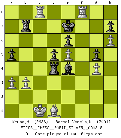 Last move : 1-0 2019 February 17 15:20:55 [Event "FICGS__CHESS__RAPID_SILVER__000218"] [Site "FICGS"] [Date "2018.10.04"] [Round "1"] [White "Kruse,Herbert"] [Black "Bernal Varela,Nelson"] [Result "1-0"] [WhiteElo "2636"] [BlackElo "2401"] 1.e4 e6 2.d4 d5 3.Nc3 Nf6 4.e5 Nfd7 5.f4 c5 6.Nf3 cxd4 7.Nxd4 Nc6 8.Be3 Bc5 9.Qd2 a6 10.O-O-O Nxd4 11.Bxd4 Qc7 12.h4 b5 13.h5 b4 14.Na4 Bxd4 15.Qxd4 a5 16.h6 g6 17.Kb1 Qa7 18.c4 bxc3 19.Qxc3 O-O 20.Qc6 Rb8 21.Rh3 Nb6 22.Qc5 Bd7 23.Nxb6 Rfc8 24.Qf2 Qxb6 25.Qxb6 Rxb6 26.Rc1 Rcb8 27.Rc2 Rb4 28.Rf3 Kf8 29.a3 Rd4 30.Bd3 Ba4 31.Rc3 Bd1 32.Rf2 Ke7 33.Rc7+ Kf8 34.Rc3 Ke7 35.Kc1 Bg4 36.b3 Bf5 37.Be2 Rb7 38.g4 Be4 39.Rf1 f6 40.Rf2 Kf7 41.Bd1 Ke7 42.Rc8 fxe5 43.fxe5 g5 44.R2f8 1-0 French : Steinitz variation Queenside Castling by player White (move 10) Kingside Castling by player Black (move 19) Player White won this chess game. Follow this game move after move (download)If cunning alone were needed to excel, women would be the best Chess players. (Albin) Ich kämpfe solange mein Gegner einen Fehler machen kann. (Emanuel Lasker) El Ajedrez es despiadado: debes de estar preparado para matar gente. (Nigel Short) La vie et les Echecs sont tous les deux une lutte constante. (Lasker) A journey of a thousand sites begins with a single click. (Author unknown)