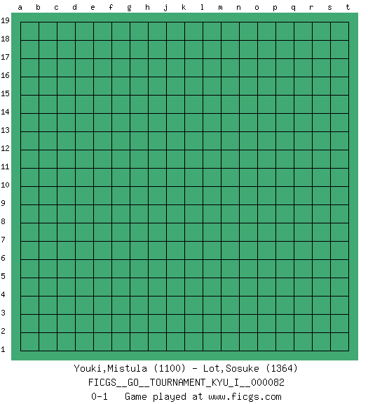 Last move : 0-1 2018 November 4 9:42:31 [Event "FICGS__GO__TOURNAMENT_KYU_I__000082"] [Site "FICGS"] [Date "2018.10.05"] [Round "1"] [Black "Youki,Mistula"] [White "Lot,Sosuke"] [Result "0-1"] [Rating 1 "1100"] [Rating 2 "1364"] 0-1 This go game has been lost on time (started : 2018.10.05 1:8:47) Here are the names of the openings (joseki) played in the four corners : Player White won this Go (weiqi, baduk) game. Follow this game move after move (download)Capture what you cut off. (Anonymous) If you work for a living, why do you kill yourself working ? (Tuco to a chicken in The Good, The Bad and The Ugly)