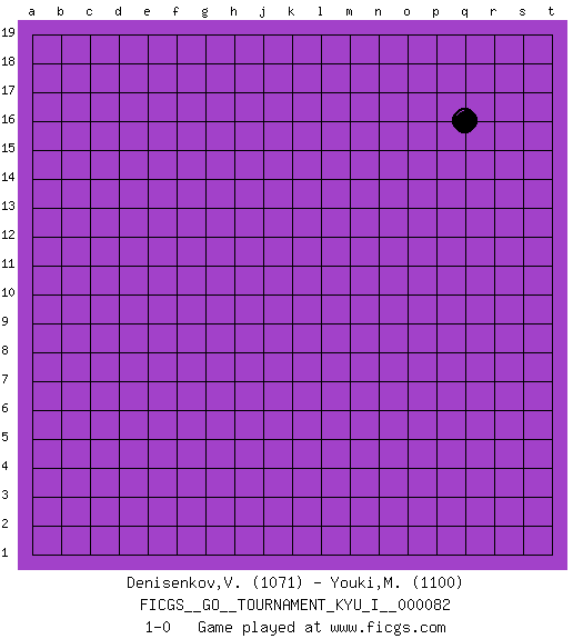 Last move : 1-0 2018 November 10 22:26:8 [Event "FICGS__GO__TOURNAMENT_KYU_I__000082"] [Site "FICGS"] [Date "2018.10.05"] [Round "1"] [Black "Denisenkov,Valentin"] [White "Youki,Mistula"] [Result "1-0"] [Rating 1 "1071"] [Rating 2 "1100"] 1.q16 1-0 This go game has been lost on time (started : 2018.10.05 1:8:47) Here are the names of the openings (joseki) played in the four corners : Player Black won this Go (weiqi, baduk) game. Follow this game move after move (download)Very few good moves are played. (Pierre Audouard) A government big enough to give you everything you want is strong enough to take everything you have. (Thomas Jefferson)
