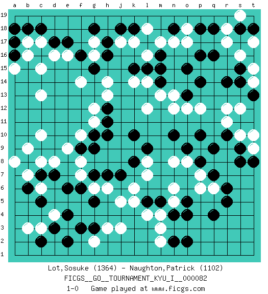 Last move : 1-0 2018 October 28 23:55:53 [Event "FICGS__GO__TOURNAMENT_KYU_I__000082"] [Site "FICGS"] [Date "2018.10.05"] [Round "1"] [Black "Lot,Sosuke"] [White "Naughton,Patrick"] [Result "1-0"] [Rating 1 "1364"] [Rating 2 "1102"] 1.q16 d16 2.q4 d4 3.f3 c6 4.d3 c3 5.c2 b3 6.e2 c10 7.e4 o17 8.r14 l16 9.o4 g17 10.q9 m3 11.n2 j3 12.m5 j5 13.j7 g6 14.e6 f8 15.g7 f7 16.f6 l4 17.l5 k5 18.g5 h6 19.h7 m2 20.c7 b7 21.d7 c8 22.b8 b9 23.b6 a8 24.c5 d8 25.h10 c13 26.d17 c17 27.e17 e16 28.c18 g2 29.g18 b17 30.h17 j17 31.h16 f14 32.j18 k17 33.r5 r12 34.r10 p12 35.q18 l7 36.k10 k6 37.n10 n12 38.o13 o12 39.o15 n13 40.m15 l14 41.m14 m13 42.l15 k14 43.k15 l12 44.k8 l8 45.l9 o8 46.o9 n8 47.p10 h14 48.k18 l18 49.m16 m17 50.n18 n17 51.p18 o18 52.p14 g11 53.g10 f10 54.h11 g12 55.p8 p7 56.q7 p6 57.b18 q6 58.r6 n5 59.o5 n6 60.a17 b16 61.a16 a15 62.a18 c15 63.o2 s12 64.g3 h3 65.n4 m4 66.h12 h13 67.f9 e9 68.g9 t15 69.s15 t14 70.t16 s16 71.t13 t17 72.s14 r17 73.p16 r18 74.s18 s19 75.t18 t9 76.s8 s10 77.t8 r11 78.s9 t10 79.f16 g16 80.g15 1-0 Here are the names of the openings (joseki) played in the four corners : Corner d4 : d4 f3 Hoshi (Hwajeom, Seongjeom, Xingwei`) 4-4 Point. The star or hoshi (4-4) point, emphasizing influence at the potential expense of territory. Ikken Kakari (Hankan Keolch'im, Yi Gua`jiao~, 1-Space Low Approach). Black 2 is the standard approach move to the 4-4. Corner q16 : q16 o17 Hoshi (Hwajeom, Seongjeom, Xingwei`) 4-4 Point. The star or hoshi (4-4) point, emphasizing influence at the potential expense of territory. Ikken Kakari (Hankan Keolch'im, Yi Gua`jiao~, 1-Space Low Approach). White 2 is the standard approach move to the 4-4. Player Black won this Go (weiqi, baduk) game. Follow this game move after move (download)Five groups might live but the six will die. (Anonymous) The smarter you play, the luckier you'll be. (Mark Pilarski)