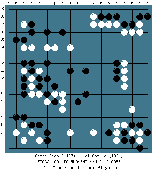 Last move : 1-0 2019 February 10 19:59:21 [Event "FICGS__GO__TOURNAMENT_KYU_I__000082"] [Site "FICGS"] [Date "2018.10.05"] [Round "1"] [Black "Cease,Dion"] [White "Lot,Sosuke"] [Result "1-0"] [Rating 1 "1487"] [Rating 2 "1364"] 1.d16 q16 2.d4 q4 3.o3 r6 4.r17 r16 5.q17 p17 6.p18 o17 7.o18 n17 8.n18 m17 9.f3 c14 10.c10 m3 11.c15 d14 12.f16 g14 13.e10 j3 14.f12 c17 15.b15 f14 16.d17 c4 17.c5 d3 18.e4 b3 19.b5 e2 20.h16 j14 21.f2 c2 22.q3 r3 23.r2 p3 24.q2 p4 25.r4 s3 26.s4 s2 27.s1 p2 28.t3 q10 29.p11 q11 30.p12 q12 31.p10 q9 32.l11 s17 33.s18 s16 34.j11 m18 35.t18 h6 36.k7 h8 37.g7 h7 38.l8 d9 39.e9 d10 40.d11 c11 41.c9 d8 42.c8 e8 43.f8 e11 44.d12 f9 45.f10 f7 46.g9 g8 47.c12 1-0 This go game has been lost on time (started : 2018.10.05 1:8:47) Here are the names of the openings (joseki) played in the four corners : Corner q4 : q4 o3 Hoshi (Hwajeom, Seongjeom, Xingwei`) 4-4 Point. The star or hoshi (4-4) point, emphasizing influence at the potential expense of territory. Ikken Kakari (Hankan Keolch'im, Yi Gua`jiao~, 1-Space Low Approach). Black 2 is the standard approach move to the 4-4. Corner q16 : q16 r17 Hoshi (Hwajeom, Seongjeom, Xingwei`) 4-4 Point. The star or hoshi (4-4) point, emphasizing influence at the potential expense of territory. Corner d16 : d16 c14 Hoshi (Hwajeom, Seongjeom, Xingwei`) 4-4 Point. The star or hoshi (4-4) point, emphasizing influence at the potential expense of territory. Ikken Kakari (Hankan Keolch'im, Yi Gua`jiao~, 1-Space Low Approach). White 2 is the standard approach move to the 4-4. Player Black won this Go (weiqi, baduk) game. Follow this game move after move (download)Don't defend - extend ! (Bill Taylor) A good book on your shelf is a friend that turns its back on you and remains a friend. (Author unknown)
