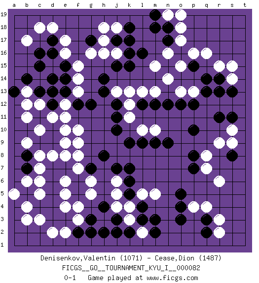 Last move : 0-1 2019 June 2 10:51:2 [Event "FICGS__GO__TOURNAMENT_KYU_I__000082"] [Site "FICGS"] [Date "2018.10.05"] [Round "1"] [Black "Denisenkov,Valentin"] [White "Cease,Dion"] [Result "0-1"] [Rating 1 "1071"] [Rating 2 "1487"] 1.c16 q16 2.d4 q4 3.o3 e17 4.g17 f3 5.e3 f4 6.d7 k4 7.l3 k3 8.l4 l5 9.o5 m5 10.q3 r3 11.q2 d15 12.d16 e16 13.e15 f15 14.e14 g16 15.c13 p4 16.o4 l2 17.m3 r6 18.m2 c3 19.c4 e2 20.d3 d2 21.k2 b3 22.j2 h17 23.g2 b4 24.r11 r9 25.r14 r15 26.q14 o17 27.p10 o15 28.p8 q8 29.p7 f14 30.e13 f13 31.f12 e12 32.d12 e11 33.g12 d11 34.c11 c10 35.d10 c14 36.d13 b11 37.c15 c12 38.b14 b13 39.d14 f10 40.j12 f7 41.b5 c5 42.d5 c6 43.d6 b6 44.b7 a5 45.f6 g6 46.f5 g5 47.c9 b9 48.d9 f9 49.b8 c7 50.f2 h3 51.j3 j4 52.e7 e8 53.g7 f8 54.h2 e5 55.h4 e6 56.k5 j5 57.k6 j6 58.k7 d8 59.k9 e4 60.l16 r2 61.j17 h18 62.j15 j18 63.k17 s14 64.s13 s15 65.r13 n14 66.n12 m13 67.m12 l13 68.l12 j13 69.h13 k13 70.h14 k12 71.j11 k11 72.j10 l10 73.n9 c18 74.k18 j16 75.k16 h16 76.k15 b17 77.a13 b12 78.d17 d18 79.h8 q7 80.n18 o18 81.n17 n16 82.j7 s10 83.s11 n19 84.m18 o13 85.o12 p13 86.p12 m15 87.m19 o19 88.g3 c8 89.l9 m10 90.m9 e9 91.p15 p16 92.q13 e10 93.s8 s9 0-1 This go game has been lost on time (started : 2018.10.05 1:8:47) Here are the names of the openings (joseki) played in the four corners : Corner q4 : q4 o3 Hoshi (Hwajeom, Seongjeom, Xingwei`) 4-4 Point. The star or hoshi (4-4) point, emphasizing influence at the potential expense of territory. Ikken Kakari (Hankan Keolch'im, Yi Gua`jiao~, 1-Space Low Approach). Black 2 is the standard approach move to the 4-4. Corner d16 : c16 e17 Komoku (Somok, Xiao~mu`) 3-4 Point. The komoku (3-4) point is the traditional corner enclosure move.. Ikken Kakari (Hankan Keolch'im, Yi Gua`jiao~, 1-Space Low Pincer). The small knight move is the basic approach move to the 3-4 point stone. It has been continually used for over four centuries. There are limitless variations, with new moves constantly being discovered. White 2 opens the door to a treaure store of joseki. Corner d4 : d4 f3 Hoshi (Hwajeom, Seongjeom, Xingwei`) 4-4 Point. The star or hoshi (4-4) point, emphasizing influence at the potential expense of territory. Ikken Kakari (Hankan Keolch'im, Yi Gua`jiao~, 1-Space Low Approach). White 2 is the standard approach move to the 4-4. Corner q16 : q16 r11 Hoshi (Hwajeom, Seongjeom, Xingwei`) 4-4 Point. The star or hoshi (4-4) point, emphasizing influence at the potential expense of territory. Player White won this Go (weiqi, baduk) game. Follow this game move after move (download)Against three in a row, play right in the center. (Anonymous) Information on the Internet is subject to the same rules and regulations as conversation at a bar. (George Lundberg)