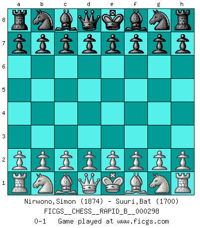 Last move : 0-1 2018 November 4 9:42:31 [Event "FICGS__CHESS__RAPID_B__000298"] [Site "FICGS"] [Date "2018.10.05"] [Round "1"] [White "Nirwono,Simon"] [Black "Suuri,Bat"] [Result "0-1"] [WhiteElo "1874"] [BlackElo "1700"] 0-1 This chess game has been lost on time (started : 2018.10.05 1:16:36) Player Black won this chess game. Follow this game move after move (download)Fischer Chess play was always razor-sharp, rational and brilliant. One of the best ever. (Dave Regis) Mit sehr nachdenklichem Gesicht schreitet Bobby durch den Turniersaal. Was ist passiert?, fragt Lombardy. Ich stehe schlecht, antwortet Fischer. Lombardy: Dann biete doch einfach Remis an. Fischer: So schlecht stehe ich nun auch wieder nicht! (Robert James Fischer) El juego de Damas es para vagabundos. (Paul Morphy) J'apprécie les joueurs d'est-indienne, c'est grâce à eux que je nourris ma famille depuis tant d'années. (Petrosian) He who is a good ruler must first have been ruled. (Aristotle)