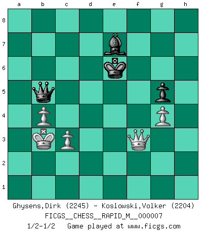 Last move : 1/2-1/2 2007 September 14 5:59:18 [Event "FICGS__CHESS__RAPID_M__000007"] [Site "FICGS"] [Date "2007.05.20"] [Round "1"] [White "Ghysens,Dirk"] [Black "Koslowski,Volker"] [Result "1/2-1/2"] [WhiteElo "2245"] [BlackElo "2204"] 1.e4 c5 2.Nf3 d6 3.d4 cxd4 4.Nxd4 Nf6 5.Nc3 a6 6.a4 e5 7.Nf3 Be7 8.Bc4 Be6 9.Qe2 Qc7 10.Bxe6 fxe6 11.O-O O-O 12.Rd1 Nc6 13.Qc4 Qc8 14.Qd3 h6 15.h3 Nb4 16.Qe2 b6 17.Ra3 Qc7 18.Rb3 a5 19.Ne1 Rac8 20.Nd3 Qc4 21.Be3 Nxe4 22.Nxe4 Qxe4 23.Nxb4 axb4 24.Rd2 Ra8 25.f3 Qf5 26.Rxb4 d5 27.Rxb6 Rxa4 28.Ra6 Ra8 29.g4 Qf7 30.Rxa8+ Rxa8 31.Kg2 Rb8 32.c3 Bh4 33.Bg1 Bg5 34.Rc2 Bf4 35.b4 Qg6 36.Ra2 Rc8 37.Bc5 h5 38.Ra7 hxg4 39.hxg4 e4 40.fxe4 dxe4 41.Rd7 Ra8 42.Rd1 e3 43.Re1 Qe4+ 44.Kg1 Bg3 45.Qxe3 Bh2+ 46.Kf1 Qh1+ 47.Ke2 Qg2+ 48.Kd3 Rd8+ 49.Bd4 e5 50.Qg5 Qd5 51.Re4 Bg3 52.Qe3 Qb5+ 53.Kc2 exd4 54.Rxd4 Rxd4 55.Qxd4 Be5 56.Qe4 Kf7 57.Kb3 Bd6 58.Qd4 Be7 59.Qe4 g5 60.Qf3+ Ke6 1/2-1/2 Sicilian : Najdorf Kingside Castling by player White (move 11) Kingside Castling by player Black (move 11) 10 pieces endgame at move 54 : White KQPPP , Black KQRBP WHITE : King + 1 Queen 3 Pawns BLACK : King + 1 Queen 1 Rook 1 Bishop 1 Pawn 9 pieces endgame at move 55 : White KQPPP , Black KQBP WHITE : King + 1 Queen 3 Pawns BLACK : King + 1 Queen 1 Bishop 1 Pawn This chess game ended in a draw. Follow this game move after move (download)Chess is the art which expresses the science of logic. (Mikhail Botvinnik) Alles was ich jemals tun will ist Schach spielen. (Robert James Fischer) Por la belleza de sus partidas, la claridad de su juego y lo brillante de sus ideas, Fischer se creó el mismo como un artista de la misma estatura como Brahms, Rembrandt y Shakespeare. (David Levy) L'action d'une oeuvre littéraire se déroule sur un champ de bataille. Les masques et les types du drame moderne correspondent aux pièces du jeu d'échecs. L'intrigue correspond aux coups et aux gambits, c'est à dire aux techniques du jeu telles qu'utilisées et interprétées par les joueurs. Les tactiques et les péripéties [mouvements] correspondent aux coups exécutés par l'adversaire. (Viktor Shklovsky) All maxims have their antagonist maxims; proverbs should be sold in pairs, a single one being but a half truth. (William Mathews)