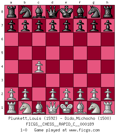 Last move : 1-0 2018 November 4 21:48:33 [Event "FICGS__CHESS__RAPID_C__000189"] [Site "FICGS"] [Date "2018.10.05"] [Round "1"] [White "Plunkett,Louis"] [Black "Dido,Michocho"] [Result "1-0"] [WhiteElo "1592"] [BlackElo "1500"] 1.c4 1-0 This chess game has been lost on time (started : 2018.10.05 1:17:28) English Opening Player White won this chess game. Follow this game move after move (download)Fischer, who may or may not be mad as a hatter, has every right to be horrified. (Jeremy Silman) Korrekt heißt in Deutschland die Haltung eines Mannes, dessen Benehmen nach dem Urteile seiner Nachbarn seiner Stellung angemessen ist. Um korrekt zu sein, muß man sich der Meinung der anderen anpassen... (Emanuel Lasker) Con o sin el título, Bobby Fischer fue sin lugar a dudas el mas grande jugador de su época. (Burt Hochberg) Nous sommes les pions de la mystérieuse partie d'Echecs jouée par Dieu. Il nous déplace, nous arrête, nous pousse encore, puis nous lance un à un dans la boîte du Néant. Epitaphe sur la tombe de David Janowsky (1868-1927). Methinks King Thibault should dub Marius Zubac a knight of the square board... I mean table, henceforth addressing him as Sir Marius, and bestow on him a suitable land from the kingdom of FICGS & marry him off to a worthy, fair maiden, lest he slice our heads with his mighty sword in his wrath. (Dinesh De Silva)