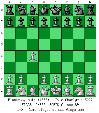 Last move : 1-0 2018 November 4 21:48:33 [Event "FICGS__CHESS__RAPID_C__000189"] [Site "FICGS"] [Date "2018.10.05"] [Round "1"] [White "Plunkett,Louis"] [Black "Ivic,Charlye"] [Result "1-0"] [WhiteElo "1592"] [BlackElo "1500"] 1.c4 1-0 This chess game has been lost on time (started : 2018.10.05 1:17:28) English Opening Player White won this chess game. Follow this game move after move (download)Even the laziest King flees wildly in the face of a double check ! (Aaron Nimzowitsch) Oft bringt ein stiller Zug das Erdbeben. (Richard Reti) Dios mío, Bobby Fischer juega tan simple. (Alexei Suetin) Ce n'est pas pour s'amuser qu'il joue aux échecs : il célèbre un culte. (Vladimir Nabokov) It is not enough to be a good player... you must also play well. (Siegbert Tarrasch)