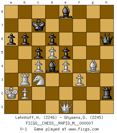 Last move : 0-1 2007 August 30 23:41:29 [Event "FICGS__CHESS__RAPID_M__000007"] [Site "FICGS"] [Date "2007.05.20"] [Round "1"] [White "Lehnhoff,Heinz-Georg"] [Black "Ghysens,Dirk"] [Result "0-1"] [WhiteElo "2246"] [BlackElo "2245"] 1.d4 Nf6 2.c4 g6 3.Nc3 Bg7 4.e4 d6 5.f3 O-O 6.Be3 Nc6 7.Nge2 a6 8.Qd2 Rb8 9.Nc1 e5 10.d5 Nd4 11.Nb3 Nxb3 12.axb3 c5 13.g4 Bd7 14.h4 h5 15.Bg5 Qb6 16.Bxf6 Bxf6 17.gxh5 Qxb3 18.Qg2 Kg7 19.Ra3 Qb6 20.hxg6 Rh8 21.gxf7 Kxf7 22.h5 Rh6 23.Kd1 Rbh8 24.Qe2 Ke7 25.Kc2 Kd8 26.Rb3 Qc7 27.Kb1 Be8 28.Qf2 Rxh5 29.Rxh5 Bxh5 30.Bh3 Be8 31.Bf5 Qg7 32.Qe1 Bh4 33.Qf1 Kc7 34.Ne2 Bf6 35.Qe1 b6 36.Bg4 Rh2 37.Ka2 Bh4 38.Qf1 Qg5 39.Nc3 Bf2 40.Qd1 Bd4 41.Qe1 Qh6 0-1 King's Indian : Saemisch, Panno formation Kingside Castling by player Black (move 5) Player Black won this chess game. Follow this game move after move (download)Before the endgame, the Gods have placed the middle game. (Siegbert Tarrasch) Ich brauche nur einen Blick auf das Schachbrett zu werfen, und weiß schon, was in der Stellung steckt, was geschehen kann und was geschehen wird. Alle übrigen suchen und prüfen, ich aber weiß es! (José Raúl Capablanca) En manos de Fischer's, una diminuta ventaja teórica es tan buena como tener una Reina de ventaja. (Isaac Kashdan) A ce moment-là, je menaçais de comprendre la position ! (Clément L'Heureux) Wawaweewa ! (Borat: Cultural learnings of America for make benefit glorious nation of Kazakhstan)