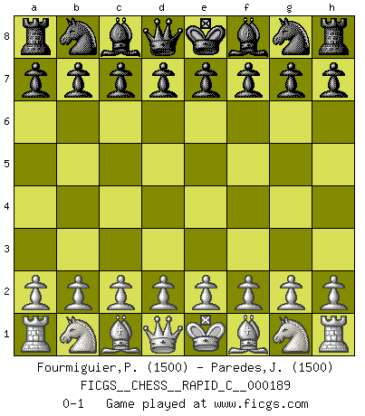 Last move : 0-1 2018 November 4 9:42:31 [Event "FICGS__CHESS__RAPID_C__000189"] [Site "FICGS"] [Date "2018.10.05"] [Round "1"] [White "Fourmiguier,Pascal"] [Black "Paredes,Jesus"] [Result "0-1"] [WhiteElo "1500"] [BlackElo "1500"] 0-1 This chess game has been lost on time (started : 2018.10.05 1:17:28) Player Black won this chess game. Follow this game move after move (download)War is the child of passion, passion is the child of narcissism and narcissism is the child. (...) Another game ? (Thibault de Vassal) Wenn Spassky eine Figur opfert kannst du genauso gut aufgeben. Aber wenn Tal eine Figur opfert, spiel weiter. Er könnte noch eine weitere opfern, und dann ... wer weiß? (Miguel Najdorf) Todavía soy una víctima del Ajedrez. Tiene toda la belleza del arte y mucho mas. No puede ser comercializado. El Ajedrez es mas puro que el arte en su posición social. (Marcel Duchamp) J'apprécie les joueurs d'est-indienne, c'est grâce à eux que je nourris ma famille depuis tant d'années. (Petrosian) Never risk one's whole fortune unless supported by one's entire army. (Niccolo Machiavelli)
