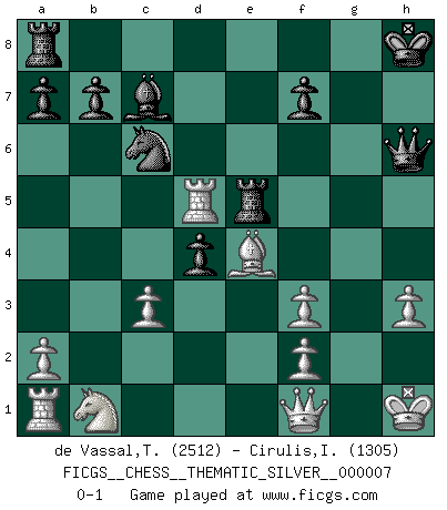 Last move : 0-1 2007 May 21 22:2:28 [Event "FICGS__CHESS__THEMATIC_SILVER__000007"] [Site "FICGS"] [Date "2007.05.21"] [Round "1"] [White "de Vassal,Thibault"] [Black "Cirulis,Ilmars"] [Result "0-1"] [WhiteElo "2512"] [BlackElo "1305"] 1.e4 e5 2.Nf3 Nc6 3.Bc4 Bc5 4.b4 Bxb4 5.c3 Ba5 6.d4 exd4 7.O-O Nf6 8.Ba3 d6 9.e5 Ne4 10.exd6 cxd6 11.Re1 O-O 12.Rxe4 d5 13.Rh4 g5 14.Nxg5 Qxg5 15.Rh5 Qg6 16.Rxd5 Re8 17.Bd3 Qg7 18.Bc1 h6 19.Qf1 Bg4 20.h3 Bf3 21.Bxh6 Qxh6 22.gxf3 Kh8 23.Be4 Bc7 24.Kh1 Re5 0-1 Evans gambit Kingside Castling by player White (move 7) Kingside Castling by player Black (move 11) Player Black won this chess game. Follow this game move after move (download)The tactician must know what to do whenever something needs doing; the strategist must know what to do when nothing needs doing. (Savielly Tartakover) Gegen einen Schachcomputer zu verlieren ist wie Löcher in den Strümpfen zuhaben. Es ist nicht peinlich, solange man der einzige ist der es weiß. (Anonymous) Diferente gente reacciona diferentemente en aceptar la derrota. (Bobby Fischer) Les erreurs sont comme les malheurs, elles n'arrivent jamais seules. (Siegbert Tarrasch) Computers have lots of memory but no imagination. (Anonymous)