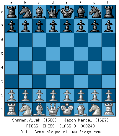 Last move : 0-1 2018 November 14 10:31:31 [Event "FICGS__CHESS__CLASS_D__000249"] [Site "FICGS"] [Date "2018.10.05"] [Round "1"] [White "Sharma,Vivek"] [Black "Jacon,Marcel"] [Result "0-1"] [WhiteElo "1588"] [BlackElo "1627"] 0-1 This chess game has been lost on time (started : 2018.10.05 3:1:42) Player Black won this chess game. Follow this game move after move (download)Kasparov : J'adoube , Ivanchuk : S'il vous plaît ! (Garry Kasparov & Vassily Ivanchuk, Linares 1997) Ich würde die 30 stärksten Spieler der USA im Simultanspiel besiegen. (José Raúl Capablanca) Nos gusta pensar. (Gary Kasparov) D'abord les bases : Jouez et étudiez, puis étudiez et jouez, ensuite jouez et étudiez, puis étudiez et jouez. Deuxièmement : Donnez toujours le meilleur de vous-même ! (Ken Smith) Optimism is a variety of information deficit. Sometimes especially true for correspondence chess games. (Michael Aigner)