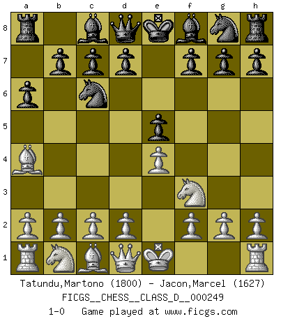 Last move : 1-0 2018 November 21 23:19:20 [Event "FICGS__CHESS__CLASS_D__000249"] [Site "FICGS"] [Date "2018.10.05"] [Round "1"] [White "Tatundu,Martono"] [Black "Jacon,Marcel"] [Result "1-0"] [WhiteElo "1800"] [BlackElo "1627"] 1.e4 e5 2.Nf3 Nc6 3.Bb5 a6 4.Ba4 1-0 This chess game has been lost on time (started : 2018.10.05 3:1:42) Ruy Lopez Player White won this chess game. Follow this game move after move (download)A bad day of Chess is better than any good day at work. (Anonymous) Sitze auf Deine Hände. (Siegbert Tarrasch) Los Peones son nacidos libres, y aún así, se encuentran por doquier encadenados. (Rick Kennedy) Karpov est une pièce de musée. (Garry Kasparov) I couldn't make any sense out of what this particular thread is about. It sounds like R2 D2 computer speaking. A space fight ?!? Some 'command' problems in Moscow ? Some killers & narcotic addicts attacking some game & a god wannabe ?? (Dinesh De Silva, lost in a russian conflict in FICGS forum)