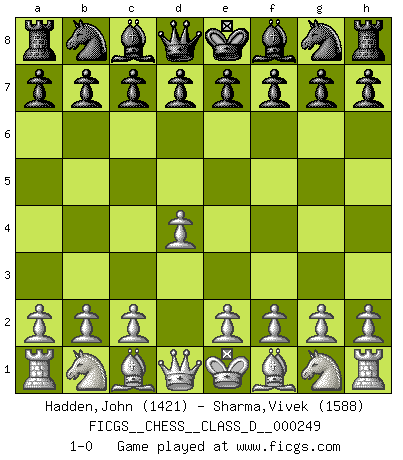 Last move : 1-0 2018 November 14 10:31:31 [Event "FICGS__CHESS__CLASS_D__000249"] [Site "FICGS"] [Date "2018.10.05"] [Round "1"] [White "Hadden,John"] [Black "Sharma,Vivek"] [Result "1-0"] [WhiteElo "1421"] [BlackElo "1588"] 1.d4 1-0 This chess game has been lost on time (started : 2018.10.05 3:1:42) Queen's pawn Player White won this chess game. Follow this game move after move (download)Nothing excites jaded Grandmasters more than a theoretical novelty. (Dominic Lawson) Ich tröste mich mit dem Vergnügen, daß Schachfans, Zuschauer und Leser glücklich sind, wenn ein Großmeister etwas riskiert, statt nur Klötzchen zu schieben. (Mikhail Nekhemyevich Tal) Aquel que ve no otra dirección en el juego que la de dar Jaque Mate a su oponente, nunca será un buen jugador de Ajedrez. (Euwe) Pour moi, les échecs ne sont pas un jeu mais un art. (Alexandre Alekhine) I teach you to lie, cheat and steal, and as soon as my back's turned you wait in line ? (Gregory House, House M.D.)