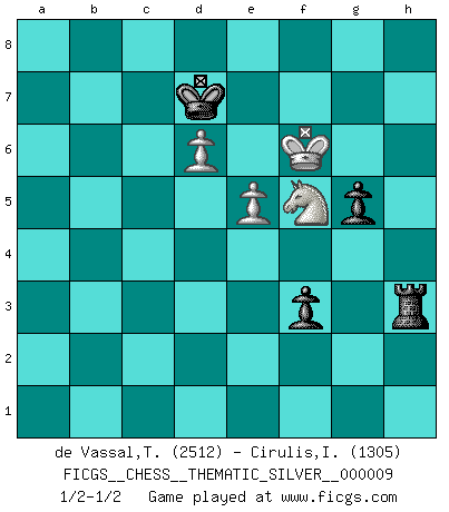 Last move : 1/2-1/2 2007 May 22 21:31:41 [Event "FICGS__CHESS__THEMATIC_SILVER__000009"] [Site "FICGS"] [Date "2007.05.22"] [Round "1"] [White "de Vassal,Thibault"] [Black "Cirulis,Ilmars"] [Result "1/2-1/2"] [WhiteElo "2512"] [BlackElo "1305"] 1.e4 e5 2.Nf3 Nc6 3.Bc4 Bc5 4.b4 Bxb4 5.c3 Ba5 6.d4 exd4 7.O-O Nf6 8.e5 d5 9.Bb5 Ne4 10.cxd4 O-O 11.Bxc6 bxc6 12.Qa4 Bb6 13.Qxc6 Rb8 14.Be3 f5 15.Rd1 Bb7 16.Qc1 Rc8 17.a4 f4 18.Bd2 a5 19.Qb2 c5 20.Bxa5 Bxa5 21.Qxb7 c4 22.Qa6 Rb8 23.Na3 Nc3 24.Nxc4 dxc4 25.Qxc4 Qd5 26.Qxd5+ Nxd5 27.Kf1 Bc3 28.Rab1 h6 29.h4 Kf7 30.Rdc1 g6 31.Rb5 Rxb5 32.axb5 Rb8 33.Ke2 Rxb5 34.Kd3 Rb2 35.Rxc3 Nxc3 36.Kxc3 Rxf2 37.d5 Rxg2 38.Kd3 g5 39.hxg5 hxg5 40.d6 Ke6 41.Nd4+ Kd7 42.Ke4 Rd2 43.Nf3 Re2+ 44.Kf5 Rg2 45.Nd4 Rg3 46.Kf6 Rh3 47.Nf5 f3 1/2-1/2 Evans gambit Kingside Castling by player White (move 7) Kingside Castling by player Black (move 10) 10 pieces endgame at move 37 : White KNPPP , Black KRPPP WHITE : King + 1 Knight 3 Pawns BLACK : King + 1 Rook 3 Pawns 9 pieces endgame at move 39 : White KNPPP , Black KRPP WHITE : King + 1 Knight 3 Pawns BLACK : King + 1 Rook 2 Pawns 8 pieces endgame at move 39 : White KNPP , Black KRPP WHITE : King + 1 Knight 2 Pawns BLACK : King + 1 Rook 2 Pawns This chess game ended in a draw. Follow this game move after move (download)Dazzling combinations are for the many, shifting wood is for the few. (Georg Kieninger) Wer nie einen Fehler gemacht hat, hat nie etwas Neues ausprobiert. (Albert Einstein) Juega la Apertura como un libro, el Juego Medio como un mago y los Finales como una máquina. (Spielmann) Demandez au pauvre Cg1 ce qu'il en pense. Eduard Gufeld à propos de la variante Saemisch de l'Est-Indienne. Life is painting a picture, not doing a sum. (Oliver Wendell Holmes, Jr.)