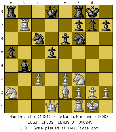 Last move : 1-0 2018 December 29 15:37:57 [Event "FICGS__CHESS__CLASS_D__000249"] [Site "FICGS"] [Date "2018.10.05"] [Round "1"] [White "Hadden,John"] [Black "Tatundu,Martono"] [Result "1-0"] [WhiteElo "1421"] [BlackElo "1800"] 1.d4 Nf6 2.Nf3 e6 3.Nc3 b6 4.e3 Bb7 5.Bd2 d5 6.Bd3 Be7 7.O-O O-O 8.a3 c5 9.dxc5 bxc5 10.Be2 Nc6 11.b4 cxb4 12.axb4 Bxb4 13.Rb1 a5 14.Na2 Bxd2 15.Rxb7 Bb4 16.c3 1-0 This chess game has been lost on time (started : 2018.10.05 3:1:42) Queen's pawn game Kingside Castling by player White (move 7) Kingside Castling by player Black (move 7) Player White won this chess game. Follow this game move after move (download)The enormous mental resilience, without which no Chess player can exist, was so much taken up by Chess that he could never free his mind of this game. (Albert Einstein) Man kann eine Schachpartie nur gewinnen, wenn das Gleichgewicht gestört ist. In einer Stellung mit ungestörtem Gleichgewicht ist auch das größte Genie hilflos - in der Stellung steckt dann eben kein genialer Einfall. (Wilhelm Steinitz) Aquel que toma al Peón de Caballo de la Reina, se pasará la noche a dormir en la calle. (Anónimo) Les Cavaliers se révèlent fort utiles dans les positions fermées. D'habitude, les Fous sont un peu plus forts que les Cavaliers dans les positions ouvertes. Qu'on le veuille ou non, il restera toujours des exceptions ! Are you threatening me, Master Jedi ? (Chancellor Palpatine in Star Wars ep.3)