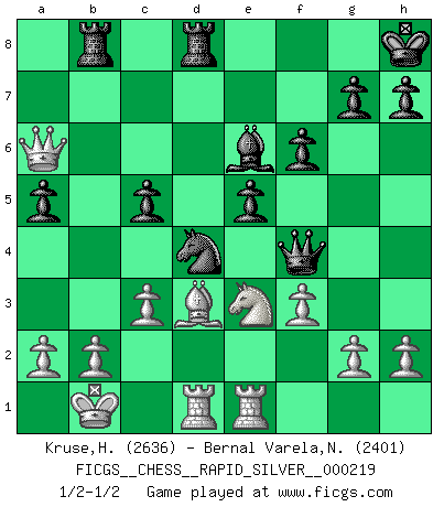 Last move : 1/2-1/2 2018 October 31 23:25:52 [Event "FICGS__CHESS__RAPID_SILVER__000219"] [Site "FICGS"] [Date "2018.10.05"] [Round "1"] [White "Kruse,Herbert"] [Black "Bernal Varela,Nelson"] [Result "1/2-1/2"] [WhiteElo "2636"] [BlackElo "2401"] 1.e4 e6 2.d4 d5 3.Nc3 Nf6 4.Bg5 dxe4 5.Nxe4 Be7 6.Nxf6+ Bxf6 7.Bxf6 Qxf6 8.Nf3 O-O 9.Qd3 Rd8 10.O-O-O c5 11.Qe4 Nc6 12.Bd3 Qh6+ 13.Kb1 Nxd4 14.Rhe1 a5 15.Ne5 f6 16.Nc4 e5 17.Ne3 Be6 18.Qxb7 Qf4 19.f3 Rab8 20.Qa6 Kh8 21.c3 1/2-1/2 French : Burn variation Kingside Castling by player Black (move 8) Queenside Castling by player White (move 10) This chess game ended in a draw. Follow this game move after move (download)After black's reply to 1.e4 with 1..e5, leaves him always trying to get into the game. (Howard Staunton) Gott hat gewollt, dass ich Champion werde. (Surab Azmajparaschvili) Aquellos que dicen entender al Ajedrez, no entienden nada. (Robert Hubner) A chaque perte on perd un peu de soi. (Joël Lautier) In God we trust, all others we virus scan. (Anonymous)