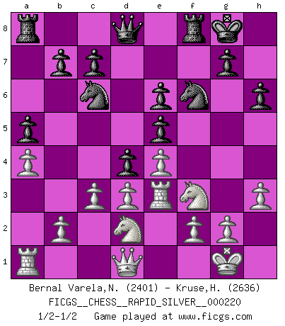 Last move : 1/2-1/2 2018 October 17 11:56:17 [Event "FICGS__CHESS__RAPID_SILVER__000220"] [Site "FICGS"] [Date "2018.10.05"] [Round "2"] [White "Bernal Varela,Nelson"] [Black "Kruse,Herbert"] [Result "1/2-1/2"] [WhiteElo "2401"] [BlackElo "2636"] 1.e4 e5 2.Nf3 Nc6 3.Bc4 Nf6 4.d3 Bc5 5.O-O d6 6.c3 O-O 7.Re1 h6 8.a4 a5 9.h3 Be6 10.Bxe6 fxe6 11.Be3 Bxe3 12.Rxe3 d5 13.Nbd2 d4 1/2-1/2 Two knights defense (Modern Bishop's Opening) Kingside Castling by player White (move 5) Kingside Castling by player Black (move 6) This chess game ended in a draw. Follow this game move after move (download)The hardest game to win is a won game. (Emanuel Lasker) Ich bin es gewohnt, das die Jugend mir überhaupt keinen Respekt entgegenbringt. (Alexander Morozewich) ¡Examina movidas que hagan daño! Un buen ojo for movidas desvastantes es mucho mas importante que el conocimiento de principios estratégicos. (Purdy) Aux échecs, l'amour-propre est satisfait quand on remporte la victoire, mais il n'y a pas de honte à être battu. (Benjamin Franklin) In theory there is no difference between theory and practice. In practice there is. (Yogi Berra)