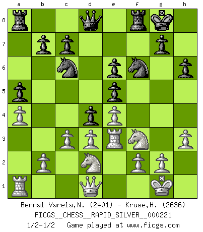 Last move : 1/2-1/2 2018 October 17 11:58:27 [Event "FICGS__CHESS__RAPID_SILVER__000221"] [Site "FICGS"] [Date "2018.10.05"] [Round "2"] [White "Bernal Varela,Nelson"] [Black "Kruse,Herbert"] [Result "1/2-1/2"] [WhiteElo "2401"] [BlackElo "2636"] 1.e4 e5 2.Nf3 Nc6 3.Bc4 Nf6 4.d3 Bc5 5.O-O d6 6.c3 O-O 7.Re1 h6 8.a4 a5 9.h3 Be6 10.Bxe6 fxe6 11.Be3 Bxe3 12.Rxe3 d5 13.Nbd2 d4 1/2-1/2 Two knights defense (Modern Bishop's Opening) Kingside Castling by player White (move 5) Kingside Castling by player Black (move 6) This chess game ended in a draw. Follow this game move after move (download)The passed pawn is a criminal, who should be kept under lock and key. Mild measures, such as police surveillance, are not sufficient. (Nimzovitch) Ich hatte meine größten Erfolge, als ich 47 Jahre alt war. Kasparow war noch nicht mal 42 und hat das Schach schon im Stich gelassen. (Viktor Kortschnoi) El Ajedrez detiene a su maestro dentro de sus propios vínculos, encadenando la mente y el cerebro, por lo que la libertad interior del mas fuerte debe sufrir. (Albert Einstein) Mon pion favori sur ma case favorite ! Bronstein en parlant d'un coup de pion en h5 quand il avait les Noirs. That's absurd. I love it. (Gregory House, House M.D.)