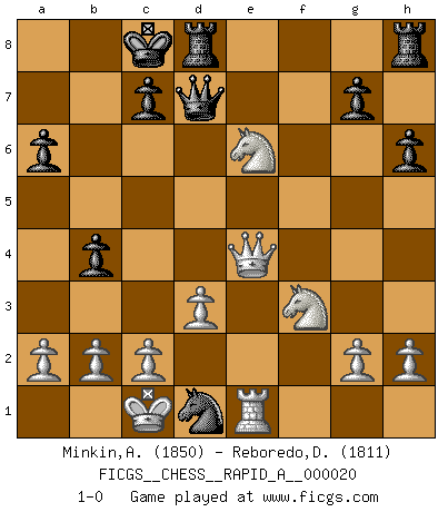 Last move : 1-0 2007 July 23 23:15:28 [Event "FICGS__CHESS__RAPID_A__000020"] [Site "FICGS"] [Date "2007.05.22"] [Round "1"] [White "Minkin,Alexander"] [Black "Reboredo,Daniel"] [Result "1-0"] [WhiteElo "1850"] [BlackElo "1811"] 1.e4 e5 2.Nc3 Nf6 3.Bc4 Bc5 4.d3 d6 5.f4 Be6 6.Bxe6 fxe6 7.Nh3 a6 8.Ng5 Qd7 9.fxe5 dxe5 10.Qf3 Nc6 11.Be3 Bxe3 12.Qxe3 Nd4 13.O-O-O O-O-O 14.Qg3 b5 15.Rhe1 b4 16.Ne2 h6 17.Nf3 Nxe4 18.Qg6 Nf2 19.Nexd4 Nxd1 20.Nxe6 e4 21.Qxe4 1-0 Vienna game Queenside Castling by player White (move 13) Queenside Castling by player Black (move 13) Player White won this chess game. Follow this game move after move (download)My God, Bobby Fischer plays so simply. (Alexei Suetin) Auf jeden Fall musst du zuerst Rechtsanwalt werden, damit du deine eigenen Interessen und die deiner Familie vertreten kannst. [Brief an seinen Sohn] (José Raúl Capablanca) Si no le temes a Spassky, entonces elimino el elemento del dinero. (Jim Slater) Les Echecs représentent une sphère d'idées créatrices basée sur la volonté des deux protagonistes. (Smyslov) Never risk one's whole fortune unless supported by one's entire army. (Niccolo Machiavelli)