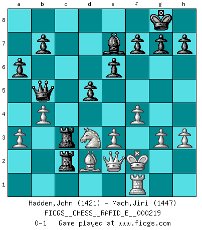 Last move : 0-1 2018 December 6 10:4:2 [Event "FICGS__CHESS__RAPID_E__000219"] [Site "FICGS"] [Date "2018.10.06"] [Round "1"] [White "Hadden,John"] [Black "Mach,Jiri"] [Result "0-1"] [WhiteElo "1421"] [BlackElo "1447"] 1.d4 d5 2.c4 c6 3.cxd5 cxd5 4.Nc3 Nf6 5.Nf3 Nc6 6.e3 a6 7.Bd3 Bg4 8.Bd2 e6 9.h3 Bh5 10.O-O Bd6 11.Be2 O-O 12.a3 Rc8 13.Ne5 Bxe2 14.Qxe2 Nxe5 15.dxe5 Bxe5 16.f4 Bd6 17.Nd1 Ne4 18.Nf2 Ng3 19.Qg4 Nxf1 20.Rxf1 Qb6 21.Nd3 Qb5 22.Qe2 Rc2 23.Kf2 Be7 24.g3 Rfc8 25.b4 R8c3 0-1 QGD Slav defense : Exchange variation Kingside Castling by player White (move 10) Kingside Castling by player Black (move 11) Player Black won this chess game. Follow this game move after move (download)The older I grow, the more I value pawns. (Paul Keres) Es ist peinlich, dass ich nie Weltmeister wurde. Es wäre leicht, Leonid Breschnjew als Ursache vorzuschieben, dessen Apparat den Vorzeigekommunisten Anatoli Karpow in allem unterstützte. Aber Garri Kasparow zum Beispiel, der ebenfalls von den Sowjets unerwünscht war, hat trotz der Widerstände den WM-Titel erobert. (Viktor Kortschnoi) Fischer es el jugador mas fuerte del mundo. De hecho, el jugador mas fuerte que jamas haya existido. (Larry Evans) La victoire dans une partie d'Echecs appartient la plupart du temps à celui qui voit un peu plus loin que l'adversaire. (Lasker) Patience, use the Force, think ! (Obi-Wan Kenobi in Star Wars ep.2)