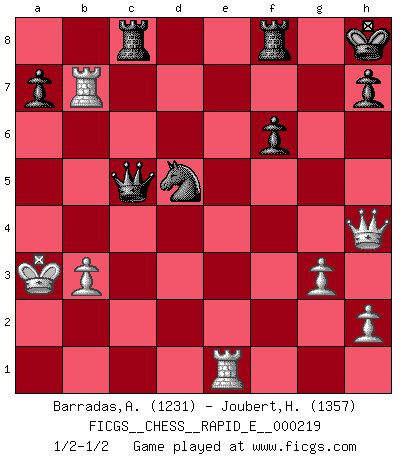Last move : 1/2-1/2 2018 November 2 14:21:29 [Event "FICGS__CHESS__RAPID_E__000219"] [Site "FICGS"] [Date "2018.10.06"] [Round "1"] [White "Barradas,Anderson"] [Black "Joubert,Hennie"] [Result "1/2-1/2"] [WhiteElo "1231"] [BlackElo "1357"] 1.e4 c5 2.Nf3 e6 3.d4 cxd4 4.Nxd4 Nf6 5.Nc3 Qb6 6.Be2 Bc5 7.Be3 Nc6 8.Nb3 Bxe3 9.fxe3 Qxe3 10.Rf1 Nxe4 11.Nxe4 Qxe4 12.g3 Nb4 13.Nd4 e5 14.Qd2 Nd5 15.Nf5 O-O 16.O-O-O Nf6 17.Nxg7 Kxg7 18.Qg5+ Qg6 19.Qh4 d5 20.Rf2 Ne4 21.Rf3 Bg4 22.Re3 Bxe2 23.Rxe2 Rad8 24.c4 Rc8 25.b3 Nc3 26.Rxe5 f6 27.Re7+ Kh8 28.Rde1 dxc4 29.Kb2 cxb3 30.axb3 Nd5 31.Rxb7 Qc2+ 32.Ka3 Qc5+ 33.Ka2 Qf2+ 34.Ka3 Qc5+ 1/2-1/2 Sicilian : Anderssen variation Kingside Castling by player Black (move 15) Queenside Castling by player White (move 16) This chess game ended in a draw. Follow this game move after move (download)Morphy was probably the greatest genius of them all. (Bobby Fischer) Mit sehr nachdenklichem Gesicht schreitet Bobby durch den Turniersaal. Was ist passiert?, fragt Lombardy. Ich stehe schlecht, antwortet Fischer. Lombardy: Dann biete doch einfach Remis an. Fischer: So schlecht stehe ich nun auch wieder nicht! (Robert James Fischer) No volvere nunca a jugar contigo. Has insultado a mi amigo. - cuando un oponente se maldijo por una mala jugada (Miguel Najdorf) Je menace de comprendre la position. (Anonyme) You have to believe in yourself. (Sun Tzu)