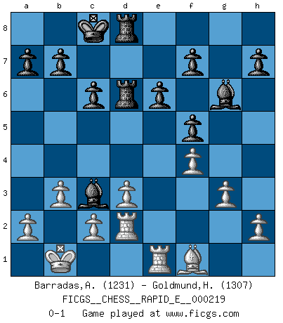 Last move : 0-1 2018 November 4 18:53:9 [Event "FICGS__CHESS__RAPID_E__000219"] [Site "FICGS"] [Date "2018.10.06"] [Round "1"] [White "Barradas,Anderson"] [Black "Goldmund,Heike"] [Result "0-1"] [WhiteElo "1231"] [BlackElo "1307"] 1.e4 d5 2.exd5 Qxd5 3.Nc3 Qa5 4.Nf3 Bf5 5.d3 Nf6 6.Bd2 c6 7.Ne4 Qc7 8.Qe2 e6 9.Bg5 Nbd7 10.Nxf6+ Nxf6 11.Bxf6 gxf6 12.Nd4 Bg6 13.g3 O-O-O 14.Bh3 Rxd4 15.O-O-O Bg7 16.f4 f5 17.Bg2 Qb6 18.b3 Qb4 19.Kb1 Qc3 20.Qd2 Qxd2 21.Rxd2 Rhd8 22.Re1 R4d6 23.Bf1 Bc3 0-1 Scandinavian (centre counter) defense Queenside Castling by player Black (move 13) Queenside Castling by player White (move 15) Player Black won this chess game. Follow this game move after move (download)The chessboard is the world, the pieces are the phenomena of the Universe, the rules of the game are what we call the laws of Nature and the player on the other side is hidden from us. (Thomas Huxley) Modernes Schach sorgt sich zuviel um Dinge wie Bauernstruktur usw. Vergessen Sie das, Schachmatt beendet das Spiel! (Nigel Short) Los errores estan ahí, esperando a que se cometan. (Savielly Tartakower) A ce moment-là, je menaçais de comprendre la position ! (Clément L'Heureux) Experiences are the keys to life. (Daniel Parmet)