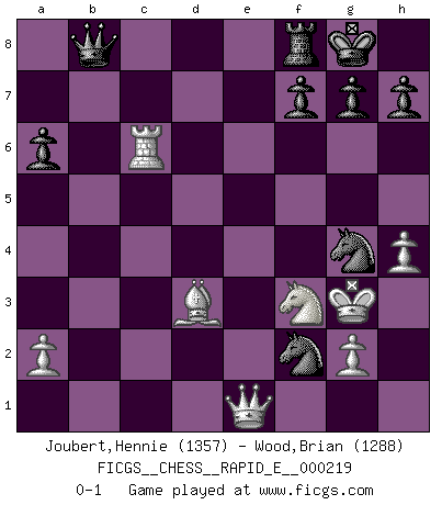 Last move : 0-1 2018 December 23 17:44:31 [Event "FICGS__CHESS__RAPID_E__000219"] [Site "FICGS"] [Date "2018.10.06"] [Round "1"] [White "Joubert,Hennie"] [Black "Wood,Brian"] [Result "0-1"] [WhiteElo "1357"] [BlackElo "1288"] 1.e4 c5 2.Nf3 d6 3.d4 cxd4 4.Nxd4 Nf6 5.Nc3 a6 6.Be3 e5 7.Nb3 Be6 8.Nd5 Bxd5 9.exd5 Be7 10.Be2 O-O 11.O-O Qc7 12.c4 Nbd7 13.f4 exf4 14.Bxf4 Nc5 15.Rc1 Nfe4 16.Be3 Rae8 17.Nd4 Bg5 18.Bxg5 Nxg5 19.h4 Nge4 20.b4 Nd7 21.Bd3 Ndf6 22.c5 dxc5 23.bxc5 Nxd5 24.c6 bxc6 25.Rxc6 Qe5 26.Nf3 Qe7 27.Re1 Qa7+ 28.Kh2 Ne3 29.Qb1 Ng4+ 30.Kh3 Nef2+ 31.Kg3 Rxe1 32.Qxe1 Qb8+ 0-1 Sicilian : Najdorf, Byrne (English) attack Kingside Castling by player Black (move 10) Kingside Castling by player White (move 11) Player Black won this chess game. Follow this game move after move (download)The hardest game to win is a won game. (Emanuel Lasker) Ja, ich habe einmal eine Blitzpartie gespielt, es war in einem Zug, 1929. --im Interview 1989 (Mikhail Moiseyevich Botvinik) El Ajedrez te enseña a controlarl la excitación inicial que sientes cuando vez algo que parece bueno y te enseña a pensar objetivamente cuando te encuentras en problemas. (Stanley Kubrick) Même si vous avez un bon coup à faire, regardez toujours s'il n'y en a pas un qui lui soit préférable. (Pedro Damiano) The production of too many useful things results in too many useless people. (Karl Marx)