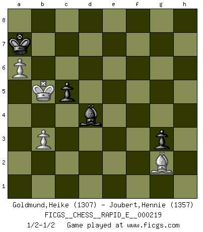 Last move : 1/2-1/2 2018 December 4 8:18:26 [Event "FICGS__CHESS__RAPID_E__000219"] [Site "FICGS"] [Date "2018.10.06"] [Round "1"] [White "Goldmund,Heike"] [Black "Joubert,Hennie"] [Result "1/2-1/2"] [WhiteElo "1307"] [BlackElo "1357"] 1.d4 Nf6 2.Nf3 g6 3.Bg5 Bg7 4.c4 O-O 5.e3 d5 6.Nc3 c6 7.Bd3 dxc4 8.Bxc4 Bg4 9.O-O Nbd7 10.h3 Bxf3 11.Qxf3 e6 12.Ne4 Qb6 13.b3 Nxe4 14.Qxe4 h6 15.Be7 Rfe8 16.Bd6 Nf6 17.Qd3 Rad8 18.Bg3 Nh5 19.Bh2 e5 20.Qe2 exd4 21.Qf3 Rd7 22.Rad1 Red8 23.Rd3 c5 24.Rfd1 Qa5 25.a4 a6 26.exd4 Rxd4 27.Qxf7+ Kh7 28.Be5 Rxd3 29.Rxd3 Qe1+ 30.Kh2 Qxe5+ 31.g3 Rf8 32.Qxb7 Rxf2+ 33.Qg2 Qxg3+ 34.Rxg3 Rxg2+ 35.Kxg2 Nxg3 36.Kxg3 a5 37.Bd3 Be5+ 38.Kf3 Kg7 39.Ke4 Bd4 40.Kd5 Kf6 41.Kd6 g5 42.Kc6 h5 43.Kb5 g4 44.hxg4 hxg4 45.Kxa5 Ke6 46.Be4 Kd6 47.Kb5 Kc7 48.a5 Kb8 49.a6 Ka7 50.Bb7 g3 51.Bg2 1/2-1/2 King's Indian : Torre attack Kingside Castling by player Black (move 4) Kingside Castling by player White (move 9) 10 pieces endgame at move 44 : White KBPPP , Black KBPPP WHITE : King + 1 Bishop 3 Pawns BLACK : King + 1 Bishop 3 Pawns 9 pieces endgame at move 44 : White KBPP , Black KBPPP WHITE : King + 1 Bishop 2 Pawns BLACK : King + 1 Bishop 3 Pawns 8 pieces endgame at move 45 : White KBPP , Black KBPP WHITE : King + 1 Bishop 2 Pawns BLACK : King + 1 Bishop 2 Pawns This chess game ended in a draw. Follow this game move after move (download)The isolated Pawn casts gloom over the entire chessboard. (Aaron Nimzovich) Ich verstehe Aljechins Kombinationen ganz gut; aber woher er diese Angriffschancen bekommt und wie er die Eröffnung behandelt das ist für mich ein Buch mit sieben Siegeln. (Rudolf Spielmann) Yo considero que Fischer es uno de los expertos mas grandes de aperturas de siempre. (Keith Hayward) Il n'y a pas eu de défaite parce que je ne crois pas que cet ordinateur ait jamais existé. IBM a triché en refusant d'imprimer les modes de recherche de la machine. C'est évident, pendant le match, des coups décisifs ont été joués par des êtres humains. Aujourd'hui, les meilleurs spécialistes en informatique ne peuvent toujours pas expliquer comment Deep-Blue a pu jouer contre la logique des ordinateurs. IBM a gagné une guerre de communication, mais ils sont incapables de prouver que l'ordinateur a gagné tout seul. (Garry Kasparov) Every now and then a man's mind is stretched by a new idea and never shrinks back to its former dimensions. (Oliver Wendell Holmes, Sr.)