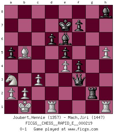 Last move : 0-1 2018 December 18 13:45:23 [Event "FICGS__CHESS__RAPID_E__000219"] [Site "FICGS"] [Date "2018.10.06"] [Round "1"] [White "Joubert,Hennie"] [Black "Mach,Jiri"] [Result "0-1"] [WhiteElo "1357"] [BlackElo "1447"] 1.e4 c5 2.Nf3 Nc6 3.d4 cxd4 4.Nxd4 Nf6 5.Nc3 e5 6.Ndb5 d6 7.Bg5 a6 8.Na3 b5 9.Bxf6 gxf6 10.Nd5 f5 11.Bd3 Be6 12.Qh5 Rg8 13.c3 Rxg2 14.Nc2 Rg6 15.Nce3 f4 16.Nc2 Ne7 17.Nxe7 Bxe7 18.O-O-O Qb6 19.f3 a5 20.Qxh7 Bf6 21.Na3 Ke7 22.Bxb5 Rh8 23.Qxh8 Bxh8 24.h4 Qe3+ 25.Kb1 Qxf3 26.h5 Rg2 0-1 Sicilian : Pelikan (Lasker/Sveshnikov) variation Queenside Castling by player White (move 18) Player Black won this chess game. Follow this game move after move (download)An attack on the wing should be met by play in the center. (Nimzovitch) Der Schachmeister von Heute braucht Courage, einen Killerinstinkt, Ausdauer und Arroganz. (Larry Evans) Por la belleza de sus partidas, la claridad de su juego y lo brillante de sus ideas, Fischer se creó el mismo como un artista de la misma estatura como Brahms, Rembrandt y Shakespeare. (David Levy) Il a essayé de se convaincre qu'il pourrait empêcher toutes les erreurs et ne jamais perdre. L'horreur ! Gary Kasparov au sujet de Robert Fischer. Don't be discouraged. It's often the last key in the bunch that opens the lock. (Author unknown)
